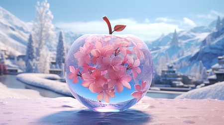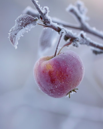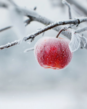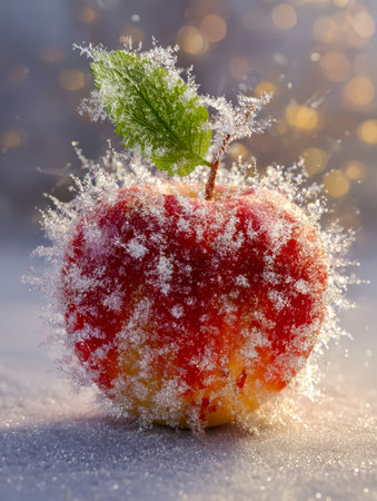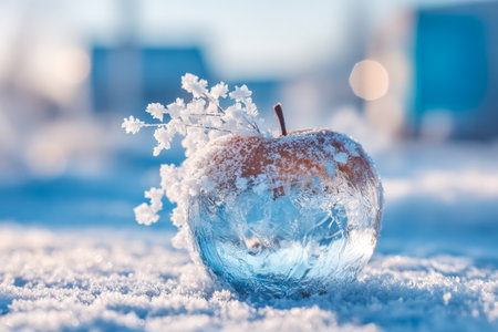 A crystalline apple encased in ice, dusted with snowflakes, resting amid a wintry scene that highlights the icy textures and serene cold atmosphere.
