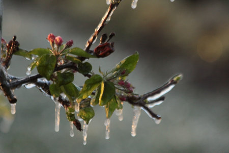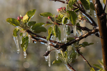 Snowflakes and ice cover the first buds of fruit-bearing flowers in early spring.