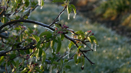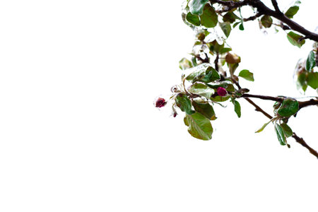Small branch of apple tree with blossom flowers and leaves covered in frosty icicle in winter ice storm in Dallas, Texas, USA isolated on white background. Homegrown seasonal agriculture photo