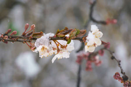 Detail of plum blossoms covered with snow and ice during springtime, which is a danger for poor harvest, Austria