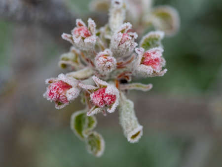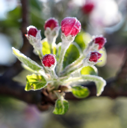 Frost on Fruit Tree Blossoms. Protecting Fruit Trees From Frost Damage. Frost Damage on Buds in Blossom Tree Fruit.