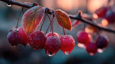 Vibrant red berries adorned with dew droplets cling to a branch, creating a serene scene at dusk. Nature's beauty shines through with fresh colors.