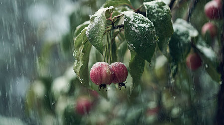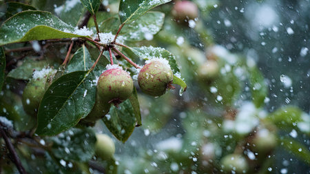 First snow falling gently on Rose apple, a few snowflakes drifting slowly and settling on the leaves; fresh air.
