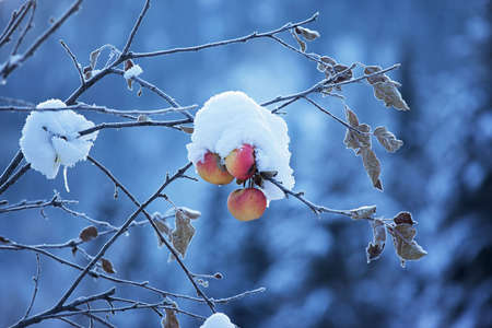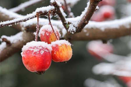 Red small wild apples with green leaves on branch covered with snow and ice. Early snow in autumn. Natural background with selective focus. Bottom view. Low angle shot.