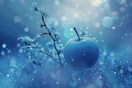 An electric blue apple rests on a snowy branch, surrounded by freezing winter grass. This macro photography captures an otherworldly atmosphere