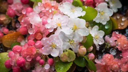 A captivating image of delicate blossoms adorned with raindrops, creating a serene and vibrant atmosphere against a dark background. Perfect for showcasing nature's beauty.