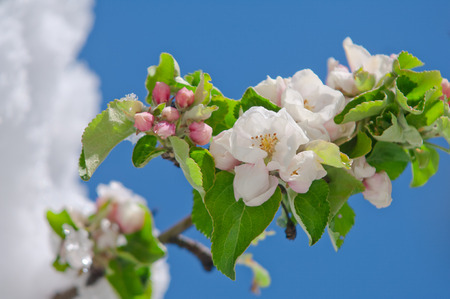 Apple blossom, blooming on apple tree after spring snowfall in April
