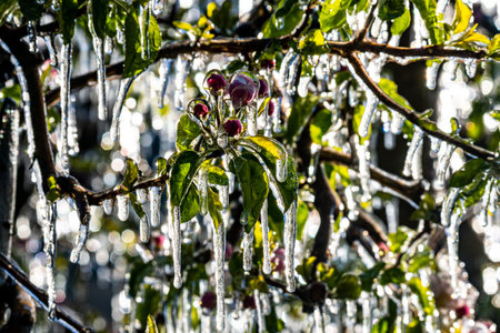 Frozen red apple flowers and leaves during winter ice storm in Dallas, Texas, USA isolated on white background. Homegrown organic fruit tree branch with frosty icicle, seasonal agriculture photo