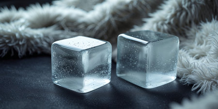AI Generated. Two clear ice cubes on a soft and fuzzy dark surface