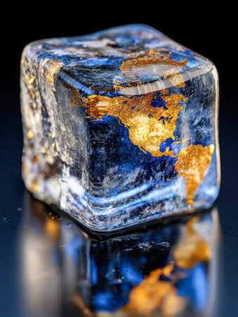 A mesmerizing icy prism encases shimmering golden terrains, highlighting a surreal globe within a crystal-clear block on a sleek, reflective dark background.