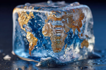 A fragile world map trapped within a transparent ice block, glistening with droplets that highlight the urgent effects of rising temperatures and climate crisis.
