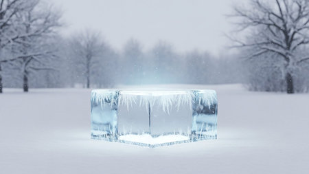 A stunning close-up of a crystal clear ice block sitting on a frozen surface, reflecting the soft natural light, showcasing the delicate textures and beauty of winter landscapes.