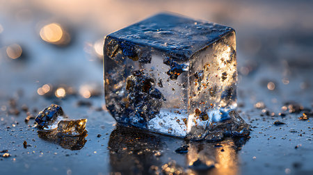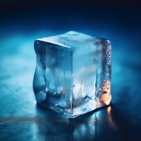 A stunning close-up of an ice cube resting on a smooth surface, beautifully illuminated to reveal its transparent qualities and intricate patterns, evoking a sense of purity and freshness.