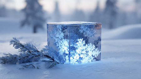 A clear ice cube rests on a frosty, snow-covered surface, catching soft morning light with a blurred, bokeh background.