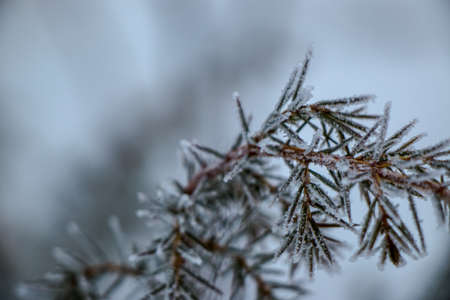 Frost on branches. Twig covered with hoarfrost.Beautiful winter seasonal natural background.Winter landscape