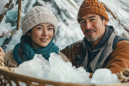 Transparent shining clear ice icicles close-up sparkling on frozen wild lake shore in sunset light. Cold winter nature background