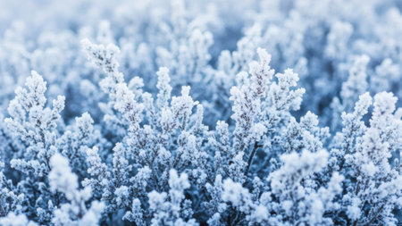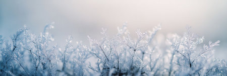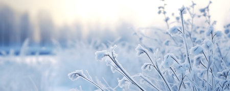 Frosty plants covered in snow, winter landscape.