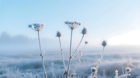 Several delicate plants covered in sparkling hoarfrost stand tall in a misty, serene winter field The cold morning light illuminates the intricate ice crystals