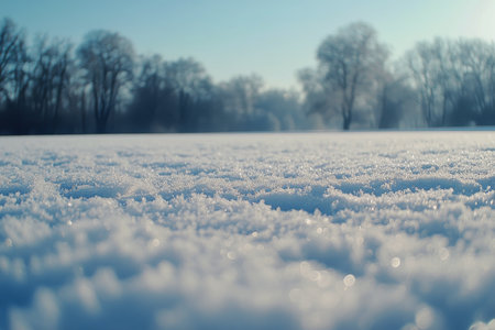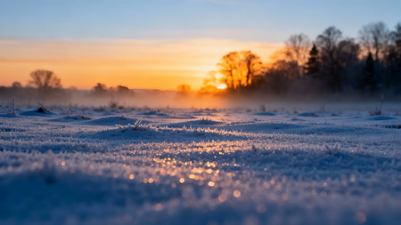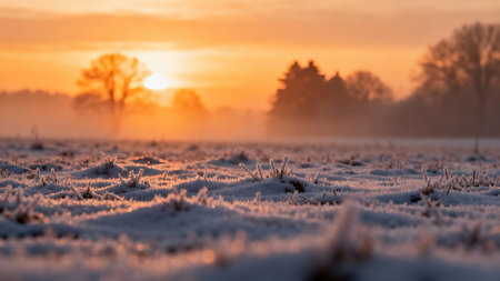 A frosty morning scene with snow covering a field creating a magical winter landscape