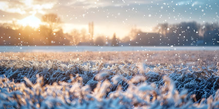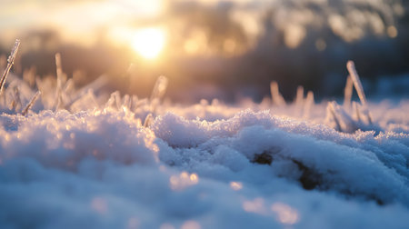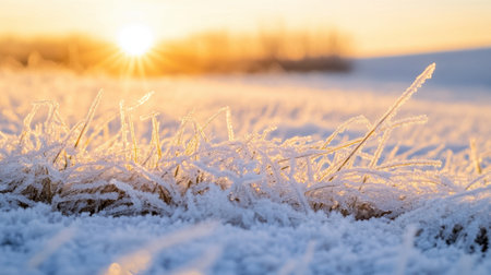 A close-up view of frosty grass covered in sparkling ice crystals illuminated by the warm light of sunrise, creating a beautiful winter scene in a snowy field.