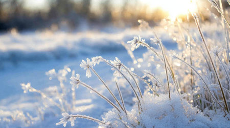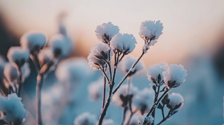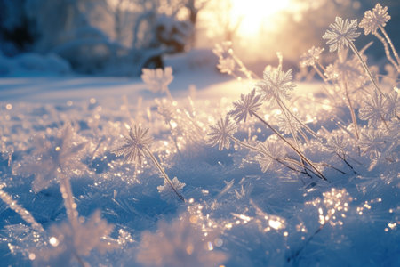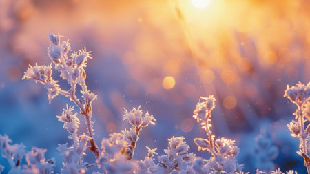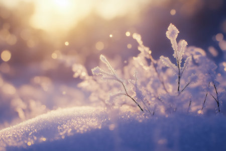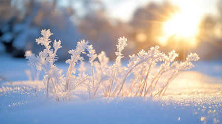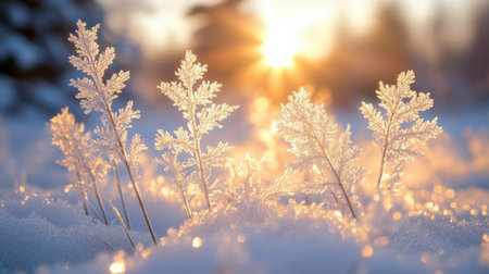 Close up of delicate frozen plants covered with a layer of sparkling snow, illuminated by the warm glow of the setting sun in a serene winter landscape
