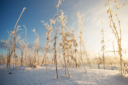 Frosted grass on a snowy field in the winter season.