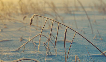 Winter Beautiful Christmas landscape, snow reed against a sunset, Shallow depth-of-field