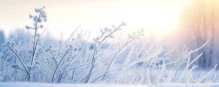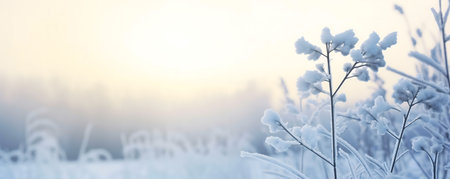 Snowy field at sunrise with frost-covered flowers in winter landscape. That the image is generated using AI.