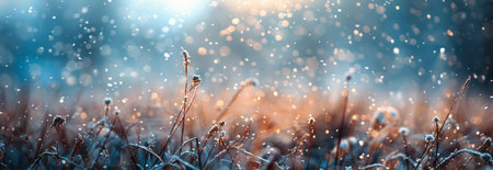 Winter landscape with frozen dry grass and snowflakes in the field