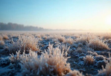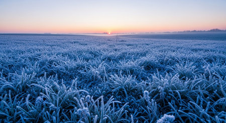 In the early morning light, a frost-covered field stretches into the horizon. The delicate crystals on the grass glimmer, creating a magical winter atmosphere.