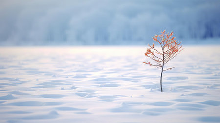 the majestic ginkgo tree stands alone on the serene snowfield, bathed in the soft, faint red morning light, beautifully captured with a handheld af400mm/f5.6 lens, showcasing the photographer's skill in backlight shooting, resulting in a stunning winter landscape photograph. ai generated