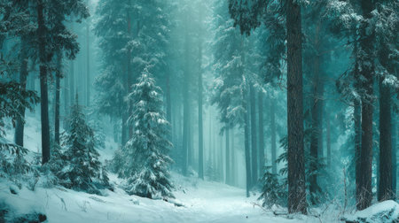 A serene winter forest scene bathed in a bright, ethereal blue light. Tall pine trees, heavily laden with snow, create a dense canopy, with soft focus in the background suggesting depth and a mystical atmosphere. The ground is completely covered in a thick blanket of white snow, with a subtle path or clearing visible leading into the frosted woodland. The overall mood is peaceful and tranquil, evoking a sense of untouched wilderness and a magical winter wonderland.