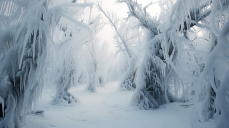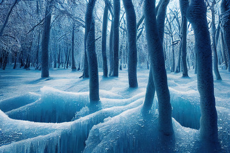 Fantasy frozen forest tree winter landscape background. Magic snowy woodland with iced plant trunks and roots wallpaper. Beauty of cold frost season nature with christmas garden