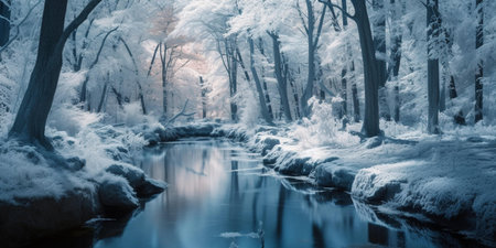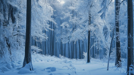 This tranquil winter landscape showcases snow-covered trees bathed in gentle light, creating a serene and peaceful atmosphere in a quiet forest.