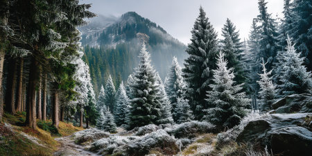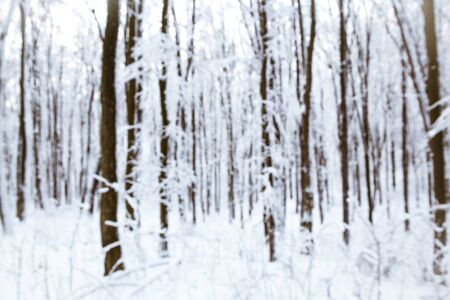 Beautiful winter forest landscape with trees covered with hoarfrost and snow