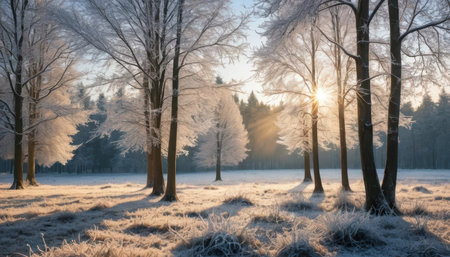 A stunning winter scene showcasing frosted grass illuminated by gentle sunlight filtering through trees, creating an enchanting and serene atmosphere.