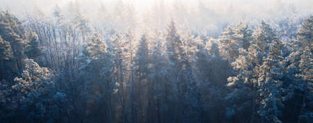 Frozen winter forest with snow covered trees. Top view. Aerial view.