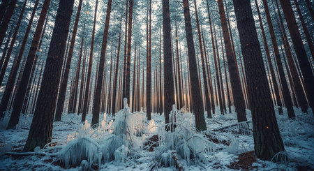 A frosty winter scene in a forest at sunrise. Snow covers the branches and ground, creating a beautiful and peaceful atmosphere.