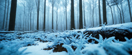 Misty winter forest scene with snow-covered ground and frosty trees in the morning light. Perfect for Christmas.