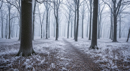 A serene and atmospheric view of a winter forest. Tall, dark tree trunks stand amidst a landscape covered in frost and ice. The branches of the trees are delicately coated in white frost, creating intricate patterns against the pale blue and gray tones of the scene. The ground is also covered in a layer of frost, giving it a sparkling, icy appearance. The overall mood is tranquil, cold, and slightly magical.