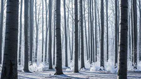A breathtaking view of a snow-covered forest showcasing tall, leafless trees enveloped in frost, capturing the peaceful essence of winter mornings.