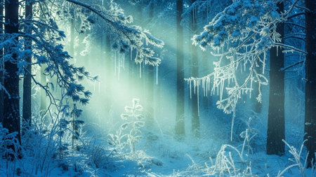 A view of a winter forest bathed in soft, ethereal sunlight. Tall trees are heavily laden with snow and adorned with delicate icicles. Sunbeams pierce through the branches, creating a magical, dappled light effect on the snow-covered ground and sparse undergrowth. The scene evokes a sense of peace, tranquility, and the serene beauty of a frozen natural landscape. The color palette is dominated by cool blues and whites with hints of green from the pine needles.
