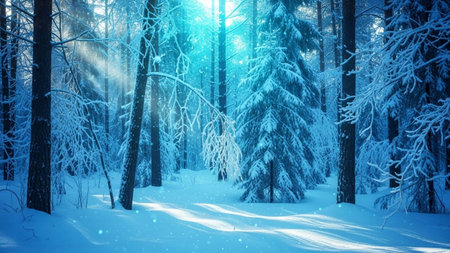 A winter forest scene with sunlight piercing through the snow-covered trees creating a magical, serene atmosphere. The frosty branches sparkle in the light, and a path appears invitingly through the woods.