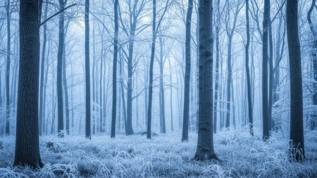 A serene winter forest scene at dawn, with numerous tall trees covered in a delicate layer of frost and ice. The bare branches create intricate patterns against a soft, misty blue and grey sky. The ground is dusted with a light layer of snow, and small frosted bushes add texture to the undergrowth. The overall atmosphere is one of profound quiet and tranquility, highlighting the stark beauty of nature in the cold season.
