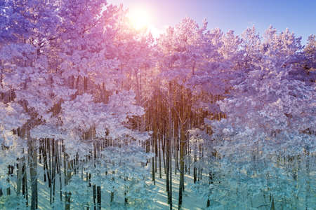 Frozen trees in winter forest at sunset. Beautiful winter landscape.