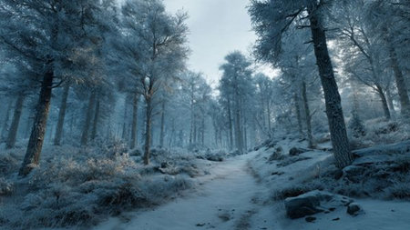 Snow blankets the ground and trees in this tranquil forest. Mist hovers over the mountains, creating a peaceful winter scene. The path leads through the beautiful landscape.