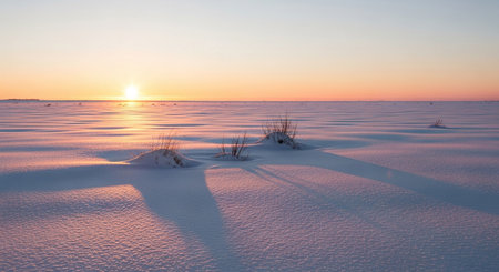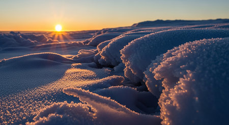 Golden sunrise illuminates sparkling frost crystals on snowdrifts with a clear horizon.