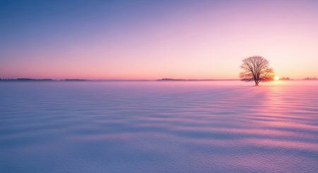 Captivating winter scene featuring a soft snow-covered landscape under a stunning gradient sky transitioning from pink to purple, evoking tranquility and beauty.