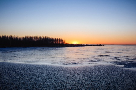 Beautiful winter landscape with frozen lake and forest at sunset. Finland
