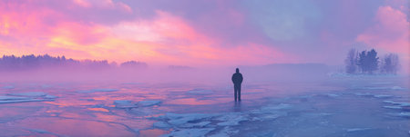 A person stands alone on a frozen lake, surrounded by ice and mist, as vibrant colors fill the sky at sunset during the winter season.